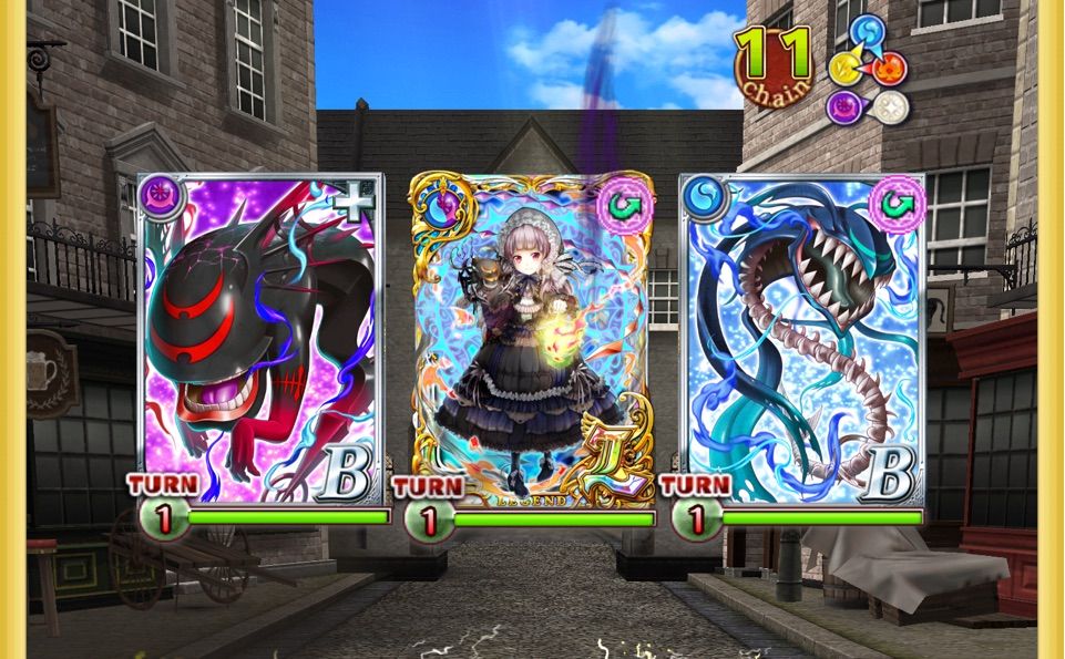 【左右の敵どちらかが倒れると怒り】 ➡闇属性変化➡チェイン封印➡全体死の秒針(5T)➡全体連撃(800ダメ×5)