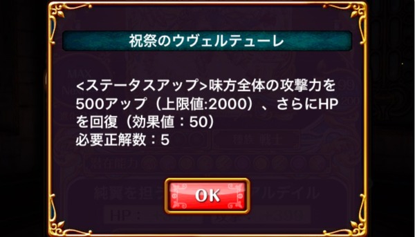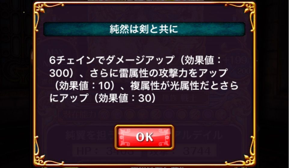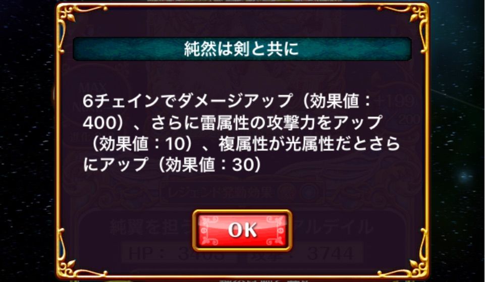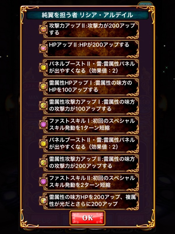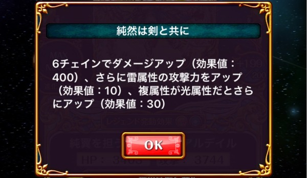 味方に雷・光属性の精霊がリシア1体しかいない場合は実質的に効果値380のダメージアップ、味方全員が雷・光属性の精霊であれば実質的に効果値500のダメージアップになります。